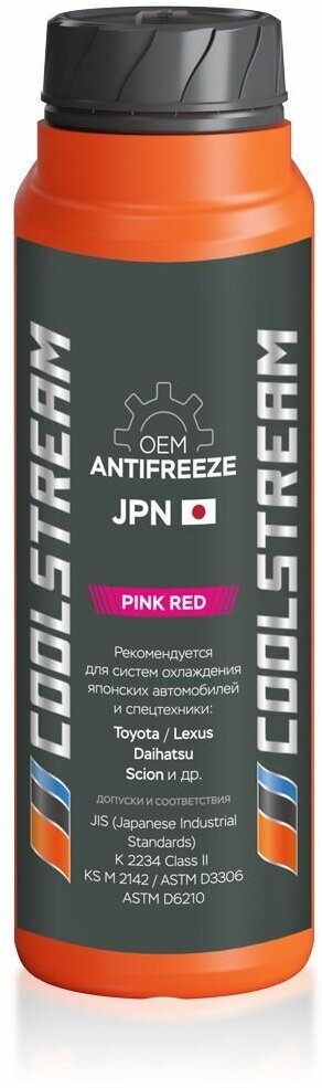 Лучшие цены. Coolstream JPN Pink Red фосфатный лобридный антифриз (P-OAT). Обладает официальным допуском Nissan (41-01-001/--U). Соответствует эксплуатационным требованиям стандартов JIS (Japanese Industrial Standards) K 2234 Class II, KS (Korean Standards) M 2142, ASTM D3306, ASTM D6210. Рекомендуется для систем охлаждения автомобилей и спецтехники с японскими двигателями (Toyota, Lexus, Daihatsu, Scion и других в соответствии с рекомендациями производителей) Coolstream JPN Pink Red антифриз длительного (увеличенного). Магазины в вашем городе.
