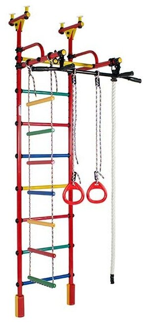 Шведская стенка ДСК Жирафик цв.красный радуга: турник, кольца, канат, верёвочная лестница