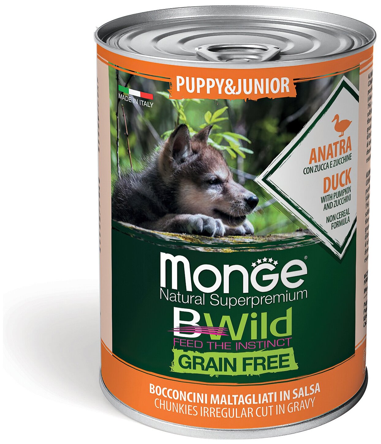 Влажный корм для щенков Monge BWILD Puppy&Junior Anatra, утка, с тыквой, с цукини, 6 шт. х 400 г