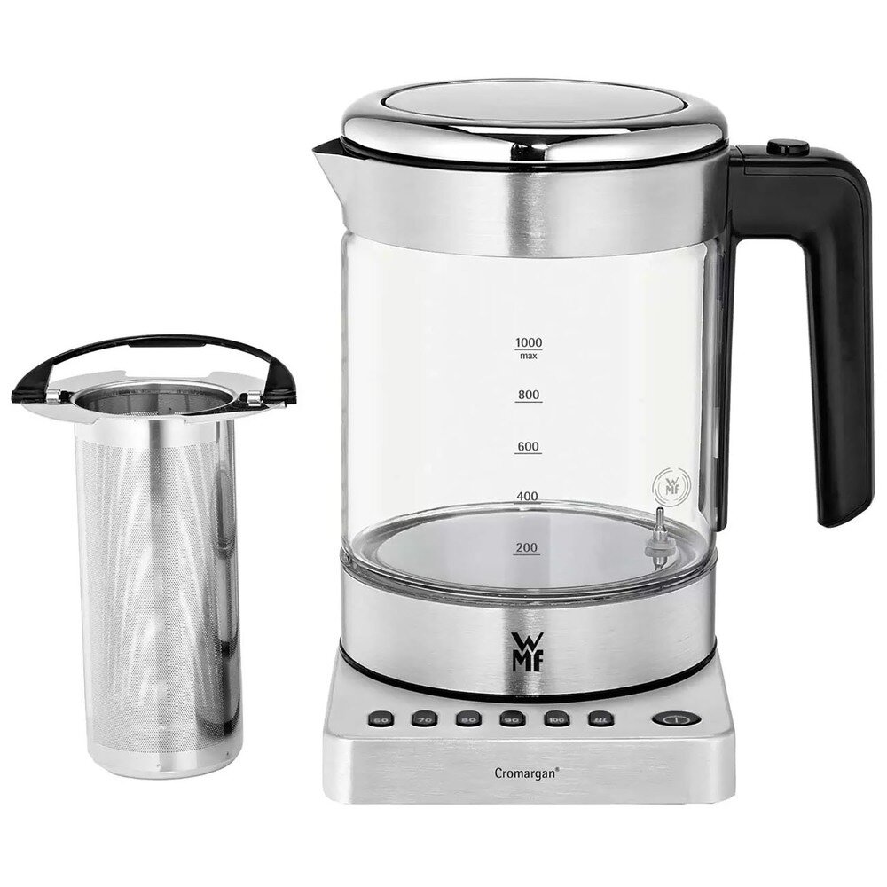 Электрический стеклянный чайник WMF Kitchenminis Vario 1 л, c 5 температурными режимами, съемным ситом для чая, Led подсветкой, из нержавеющей стали Cromargan и термостойкого стекла, 1900 Вт