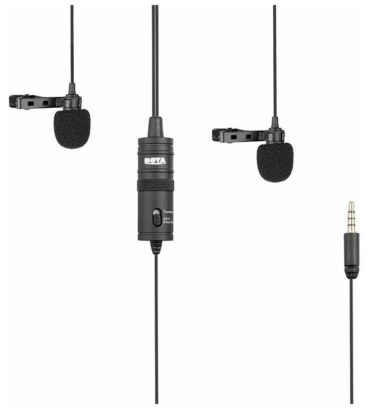 Лучшие цены. Boya BY-M1DM – это версия популярного микрофона BY-M1, но с двумя петличками. Недорогой, бюджетный вариант для записи интервью. Длина кабеля от разветвителя до микрофона – 2.8 м, от разветвителя до камеры – 1.2 м. Микрофон BY-M1DM может использоваться как с камерами (разъем TRS), так и с мобильными устройствами или ноутбуками с комбинированным входом (TRRS). В первом случае требуется питание от батарейки LR44, во втором – питание не требуется. Оба микрофона записываются с объединением в 1 канал. Магазины в вашем городе.