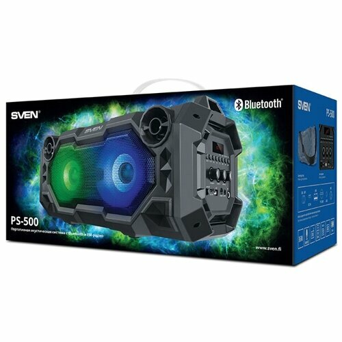 Лучшие цены. Колонка портативная Sven PS-500 2x18 Вт (RMS), Bluetooth, FM, USB, microSD, LEDдисплей, встроенный аккумуляторКолонка Sven PS-500 — это многофункциональная портативная акустическая система мощностью 36 Вт с подсветкой динамиков и возможностью как проводного так и беспроводного подключения через Bluetooth интерфейс. Портативная колонка имеет встроенный FM радиоприёмник и встроенный MP3 плеер с поддержкой загрузки файлов с внешних носителей USB и карт памяти microSD. Магазины в вашем городе.