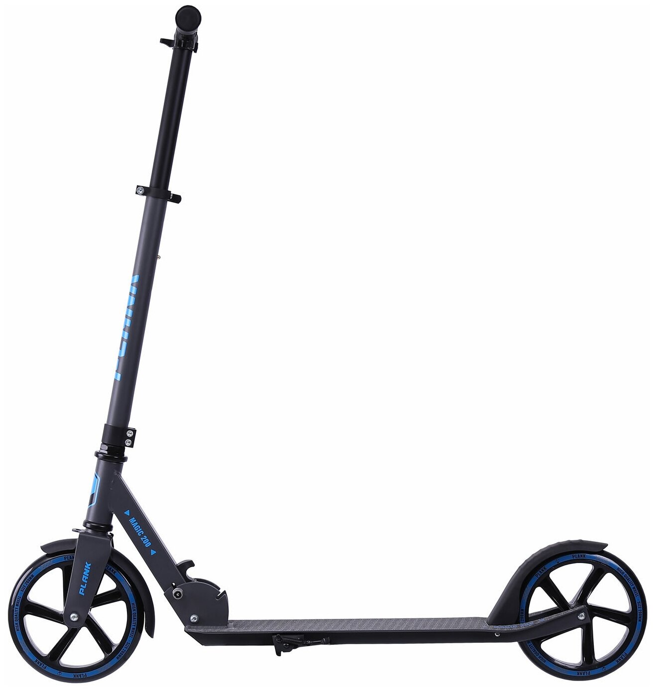 Лучшие цены. О самокате Plank Magic 200 Хит продаж среди недорогих самокатов. У данной модели классический рычаговый складной механизм - он рассчитан на многократные сложения. Вес небольшой - такой транспорт удобно переносить и перевозить. Самокат тормозит после нажатия ногой на заднее крыло - самый надежный способ. Мы рекомендуем данную модель к катанию по городу непритязательным пользователям. Обычно такой транспорт используется без поломок около 2 лет. Магазины в вашем городе.