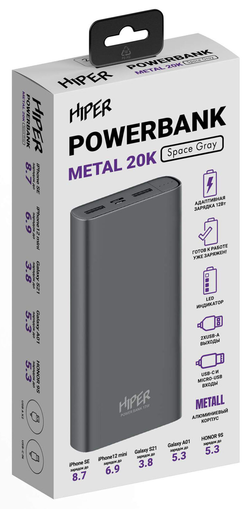Лучшие цены. Мобильный аккумулятор Hiper Metal20K 20000mAh 2.4A 2xUSB темно-серый (METAL 20K SPACE GRAY). Магазины в вашем городе.