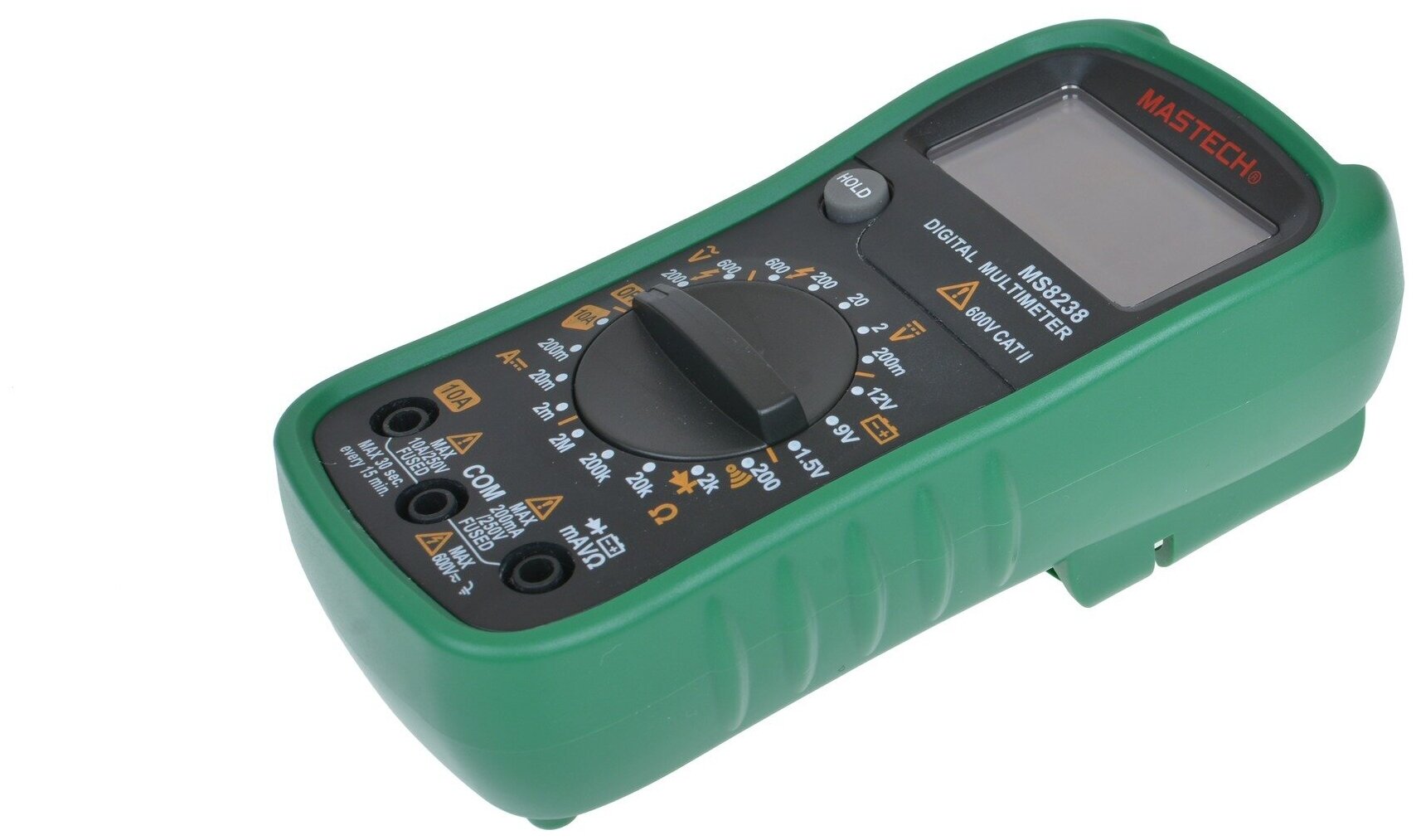 Лучшие цены. Универсальный мультиметр MASTECH MS8238 в кожухе 13-2026 имеет компактные размеры, благодаря чему его можно всегда держать под рукой. С его помощью производится измерение напряжения, постоянного тока и сопротивления, а также проверка батарей 1.5 В, 9 В и 12 В. Прибор оснащен удобным переключателем режимов измерения. Прорезиненный корпус обеспечивает устойчивость к механическим повреждениям. Функция HOLD способна задерживать данные на экране, что упрощает работу в труднодоступных местах. Магазины в вашем городе.