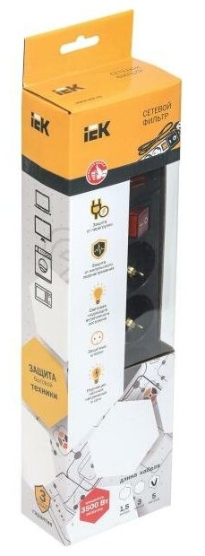 Сетевой фильтр СФ-05К-выкл. 5 мест 2Р+PЕ/3м 3х1мм2 16А черный IEK