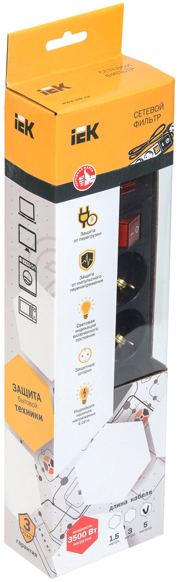 Сетевой фильтр СФ-05К-выкл. 16А 5 мест 3м 3х1мм2 черный IEK (1 шт.)