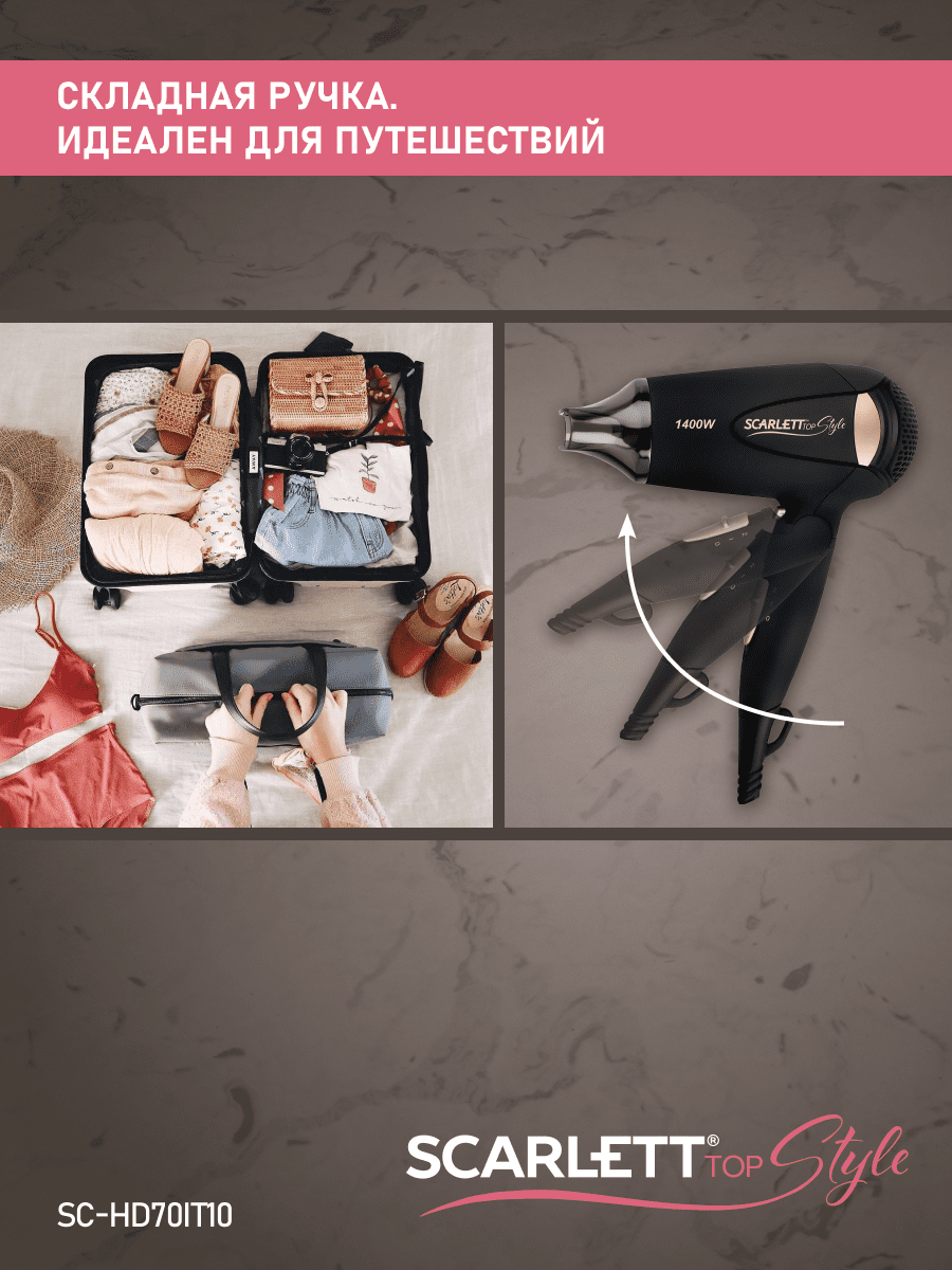 Фены и приборы для укладки Складной фен для волос Scarlett SC-HD70IT10, 1400 Вт, турмалиновая ионизация, 2 скорости, 2 температурных режима, 1 насадка