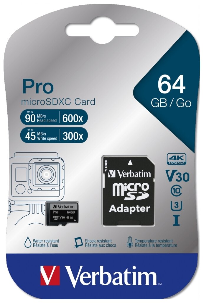 Карта памяти Verbatim Pro microSDXC 64GB UHS-I U3 V30, R/W 90/45 МБ/с с адаптером