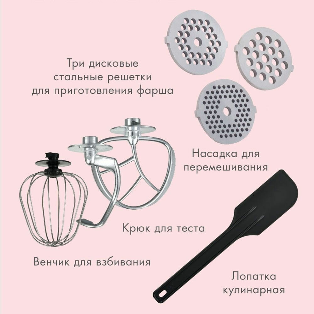 | Аксессуары | венчик для взбивания, насадка / крюк для замеса теста, лопатка для перемешивания (биттер) |