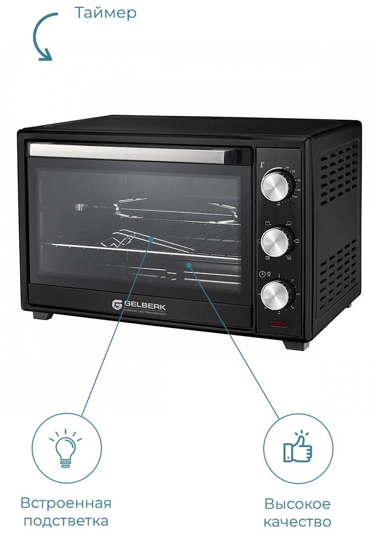 Лучшие цены. Стильная мини-печь GelberkGL-26B с металической решеткой, противенем, ухватом и вертелом в комплекте, регулировкой температуры и таймером станет вашей незаменимой маленькой помощницей как дома, так и на даче. Вы можете разогревать печь до 250 градусов, а также установить таймер до 60 минут. Целых пять режимов работы позволят воплотить любую вашу задумку. В модели присутствует индикатор работы (горит лампочка), а также звуковой сигнал завершения работы. Магазины в вашем городе.
