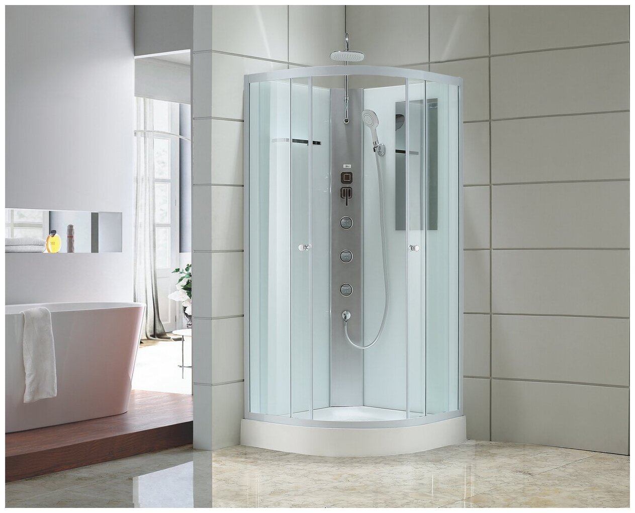 Лучшие цены. Форма: четверть круга, Ширина, см: 90, Глубина, см: 90, Высота, см: 225, Вид поддона: средний, Исполнение полотна двери: прозрачное, Гидромассаж в кабине: есть, Высота поддона, см: 15, Глубина поддона, см: 3, Турецкая баня: нет, установка не предусмотрена, Зона гидромассажа: гидромассаж спины, Вход: спереди, Управление: ручное, Цвет профиля: хром, Цвет задней стенки: белый, Цвет корпуса: белый, Материал поддона: АБС-пластик, Наличие крыши: открытая, без крыши, Исполнение задней стенки: стекло, тонированное. Магазины в вашем городе.