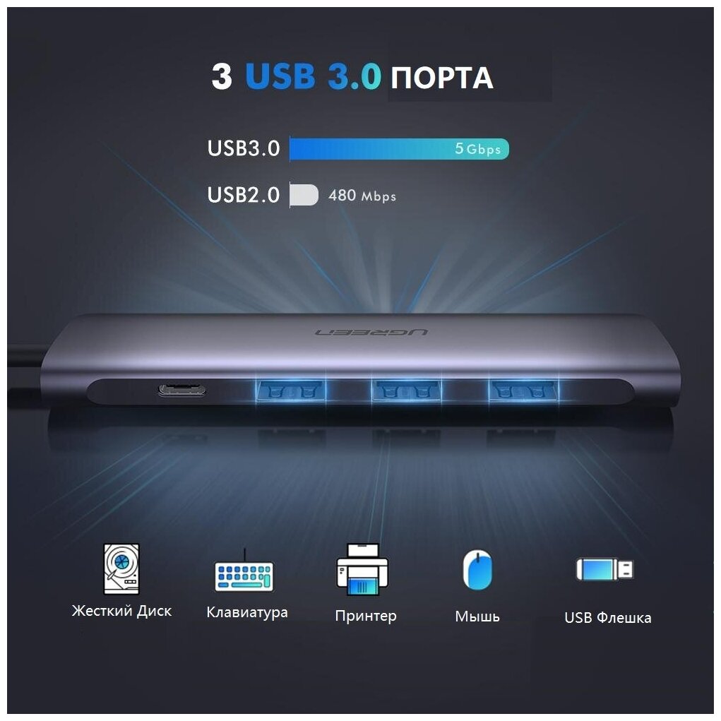 Разветвитель USB UGREEN 5 в 1 , 3 х USB 3.0, HDMI, PD (50209) 1602452