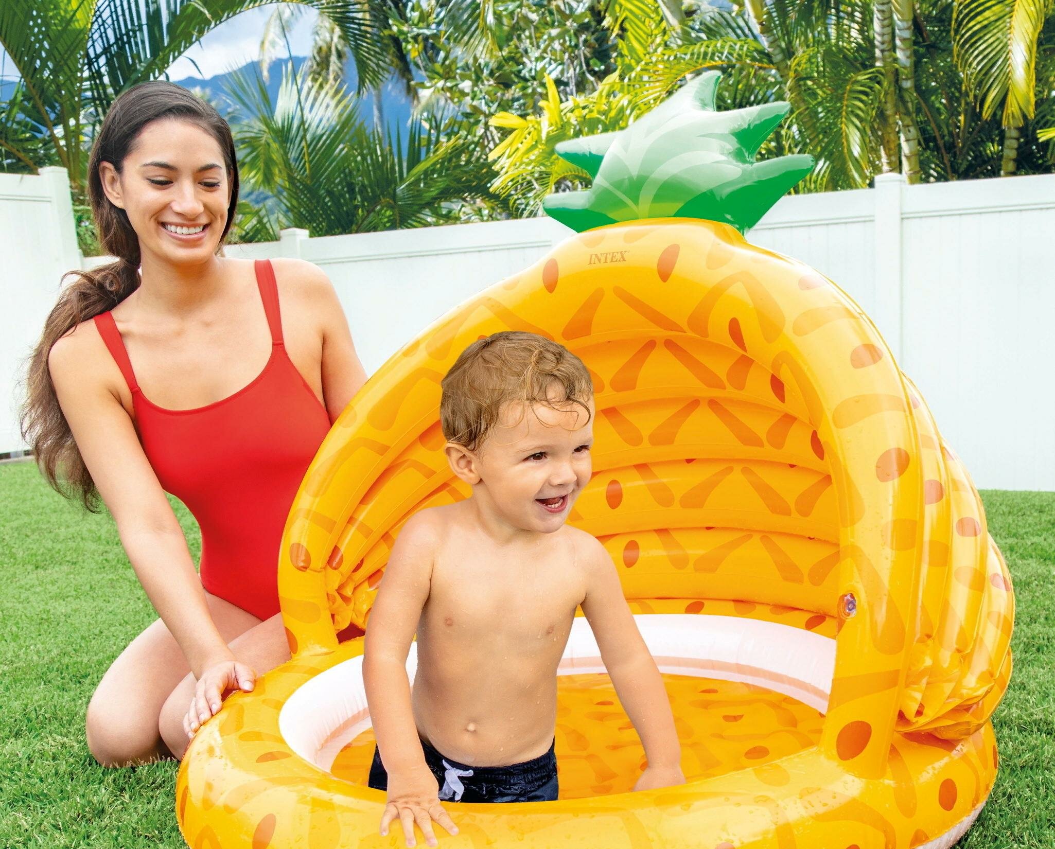 Лучшие цены. Детский надувной бассейн 102х94 см "Ананас" 45 л, от 1 до 3 лет (Intex 58414). Собственный бассейн с надувным дном - ни с чем не сравнимое удовольствие! Детский бассейн "Ананас" - отличный бассейн для детей от 1 до 3 лет. Надувное дно, низкие и широкие бортики предостерегут от травм ребёнка во время игры, а навес защитит от солнца. Характеристики: Размеры: 102х94 см Емкость воды (13 см). Магазины в вашем городе.