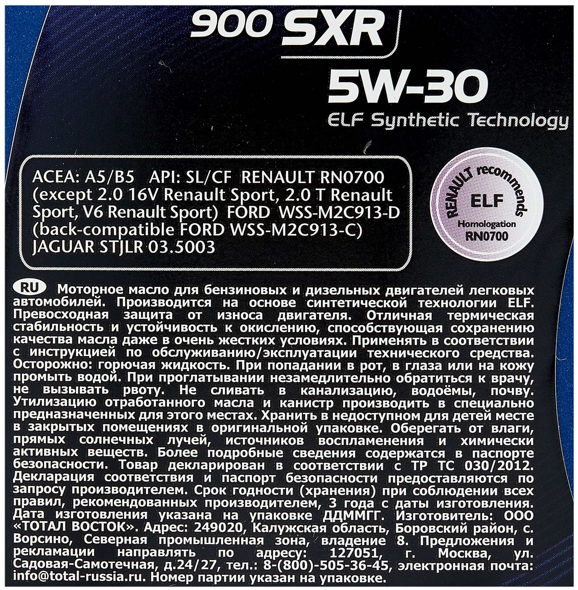 ELF ELF 5W30 EVOLUTION 900 SXR/5 Масло моторное синтетическое 5л - ACEA A5/B5, API SL/CF, RN0700 (бензиновые двигатели исключая 2.0 16V/2.0 T/V6 Renault Sport), STJLR.03.5003, Ford WSS-M2C913-A/B/C/D 1шт