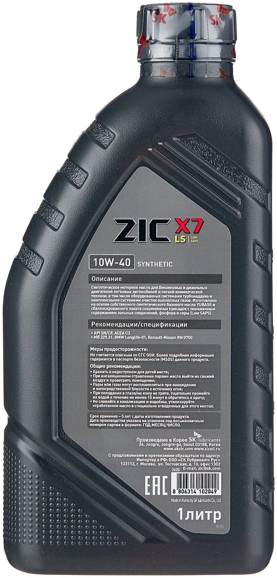10/40 X7 LS ZIC 6л. синт. API SN/CF Масло моторное /кор.3шт./ 172620 ZIC 172620 | цена за 1 шт