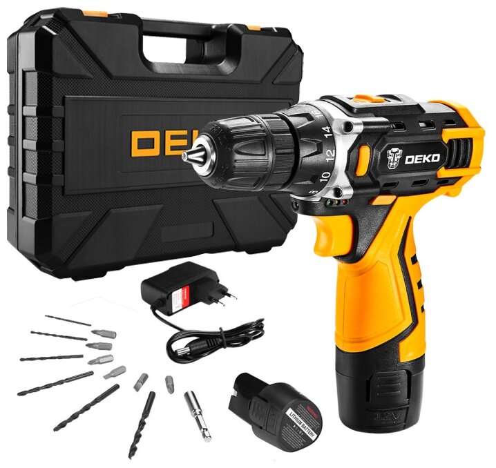 Дрель-шуруповерт аккумуляторная DEKO DKCD12FU-Li 2*12В 1.5Ач Li-Ion, оснастка 13 предметов