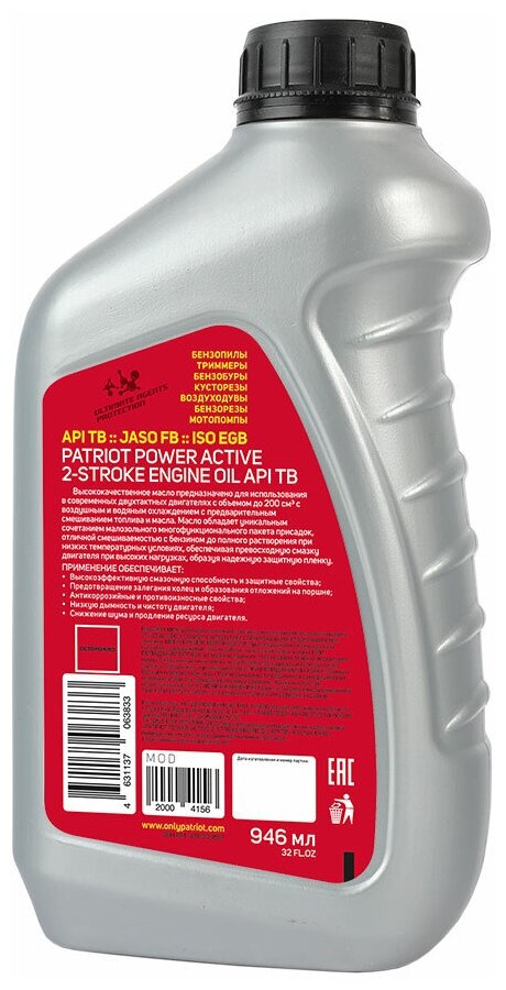 Масло для 2-тактных двигателей PATRIOT Power Active 2T 0,946 л, бут.