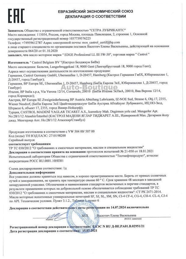 | Соответствие стандартам | API SN/CF; ACEA C3 |