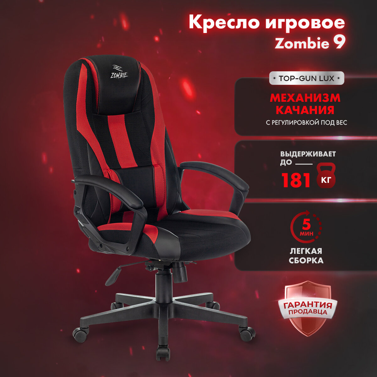 Кресло игровое компьютерное Zombie 9 RED черный/красный, текстиль/эко.кожа, крестовина пластик