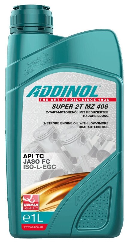 Лучшие цены. ADDINOL Super 2T MZ 406 — это высокоэффективное синтетическое масло для двухтактных двигателей. За счет содержащихся в масле синтетических компонентов обеспечивается низкое дымовыделение (low smoke). области применения · Продукт рекомендуется для термически высоконагруженных двухтактных двигателей с воздушным и водяным охлаждением (мотороллеры, мопеды, легковые автомобили, мотоциклы, снегоходы). Магазины в вашем городе.