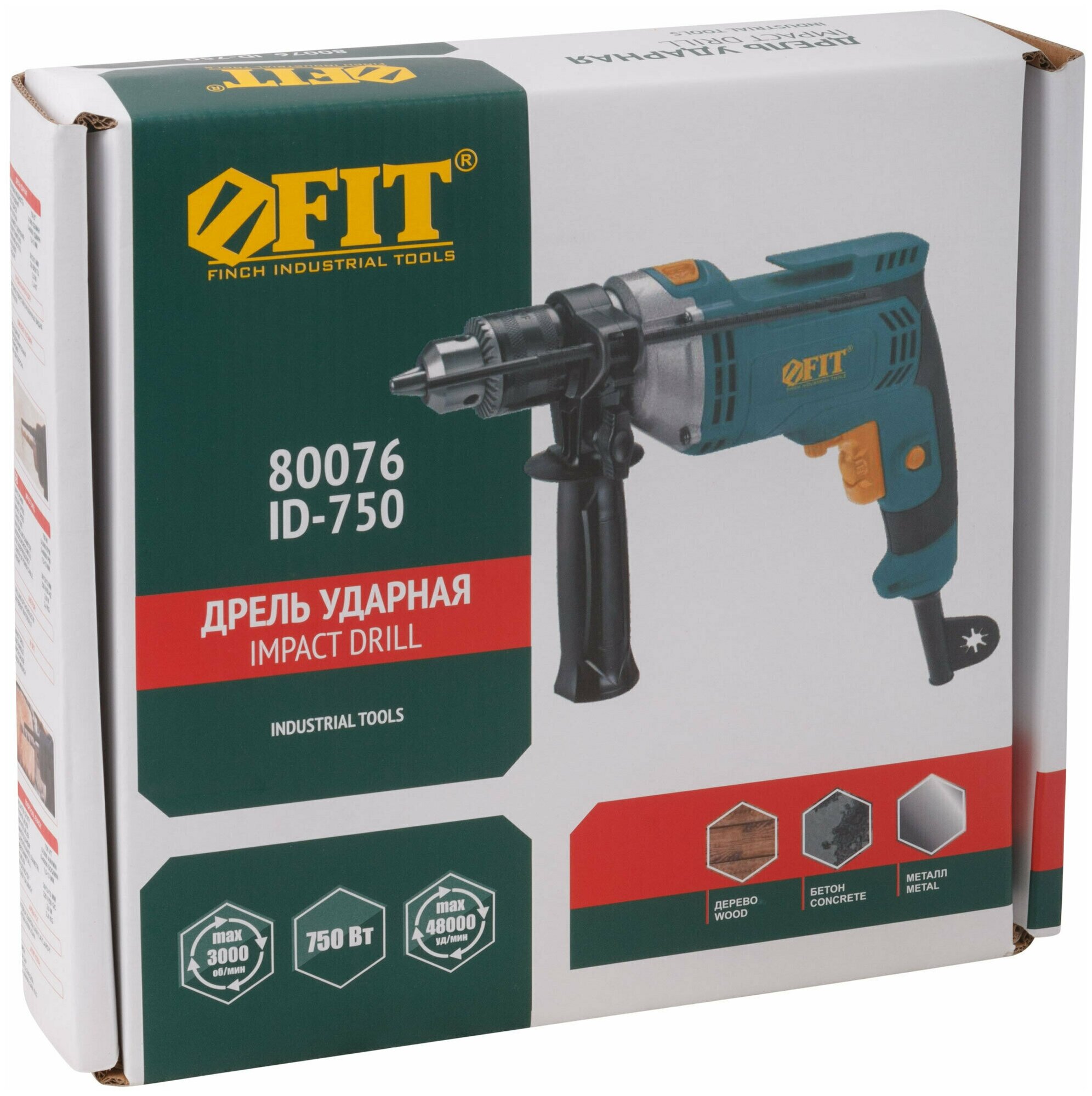 Дрель/шуруповерт Дрель ударная 750 Вт, 0-3000 об/мин, КлП 13мм, мет. корп., рез. накл., коробка FIT 80076