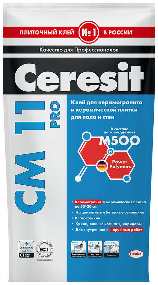 Лучшие цены. Клей CM 11 PRO предназначен для крепления керамических, керамогранитных и каменных плиток (кроме мраморных) размером до 50×50 см на полах и стенах внутри и снаружи зданий. Рекомендован для применения на минеральных недеформирующихся основаниях: бетоне, цементных стяжках, цементных и цементно-известковых штукатурках и т.п. Пригоден для устройства плиточных облицовок на покрытии из гидроизоляционной смеси CR 65. Магазины в вашем городе.