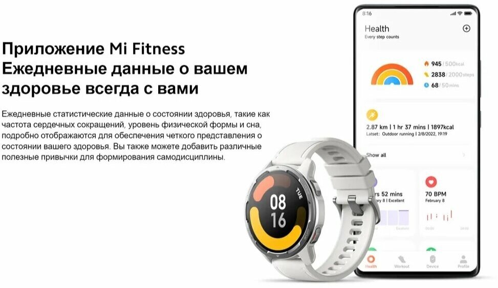 Умные smart часы для мужчин наручные Ксиаоми S1 Watch GL-Active (Moon White) (BHR5381GL). Мониторинг: Сердечного ритма, Сна, Физической активности