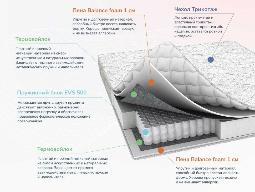 Лучшие цены. Отличный вариант для дачи или гостевого спального места. В основе матраса лежит блок, содержащий около 250 независимых пружин на квадратный метр. Так как пружинки не соединены друг с другом, матрас будет прогибаться только в месте давления, обеспечивая точечную поддержку всем частям тела. С обеих сторон расположены тонкие (1 см) слои высококачественной пены balance foam - недорогого, но долговечного и качественного, искусственного материала. Он достаточно мягкий, упругий и эластичный. Магазины в вашем городе.