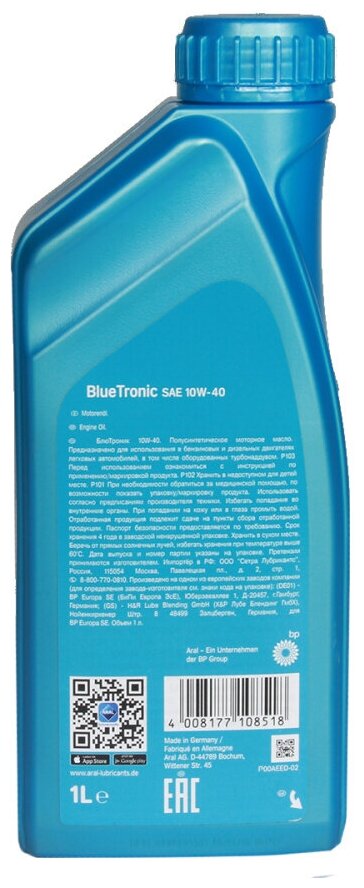 Лучшие цены. Масло моторное Aral BlueTRONIC 10W-40 - полусинтетическое масло обладает легкой тякучестью, является всесезонным. Обеспечивает экономию топлива, высокую надежность смазки, защиту от износа, предотвращает появление отложений, гарантирует чистоту двигателя и отличные характеристики при холодном старте. Спецификации и допуски: ACEA A3/B4; API SL/CF; MB-Approval 229.1; VW 501 01/ 505 00. Магазины в вашем городе.