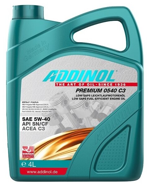 Лучшие цены. Стопроцентно синтетическое универсальное моторное масло. Продукт дополнен тщательно подобранным комплексом присадок low SAPS, то есть данное моторное масло идеально подойдет для современных дизельных агрегатов, оснащенных системами доочистки и нейтрализации выхлопных газов. Addinol Premium 0540 C3 продукт стандарта Euro VI. Рекомендовано так же для автомобилей работающих на природном (CNG) и сжиженном (LPG) газе. Магазины в вашем городе.