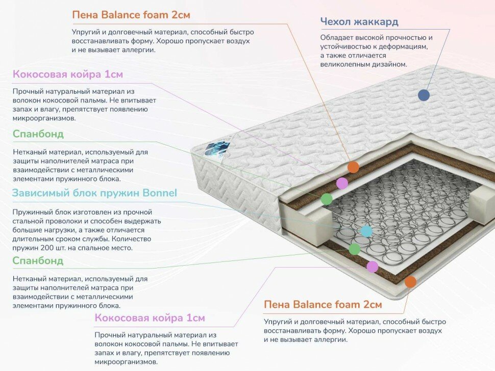 Лучшие цены. Практик Медиум Лайт Bonnel - матрас средней жесткости с симметричным наполнением. В основе модели лежит зависимый пружинный блок Боннель. Используется в качестве основы матраса уже многие десятилетия. Представляет собой взаимосвязанные пружины. Главным минусом такого блока является появляющийся со временем эффект гамака. Комфортный слой представлен сочетанием кокосовой койры и ортопедической пены. Внутренним наполнителем является кокосовая койра. Придает спальному месту дополнительную жесткость. Магазины в вашем городе.