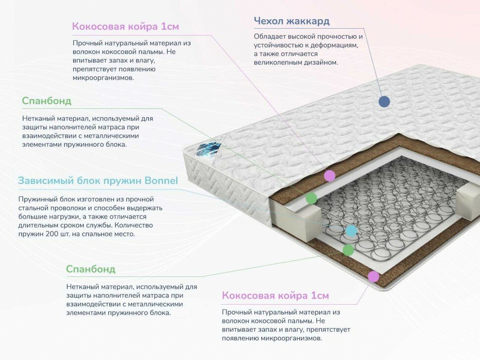 Лучшие цены. Практик Хард Bonnel - самый жесткий из матрасов на зависимом пружинном блоке. В основе модели лежит зависимый пружинный блок Боннель. Используется в качестве основы матраса уже многие десятилетия. Представляет собой взаимосвязанные пружины. Главным минусом такого блока является появляющийся со временем эффект гамака. Комфортный слой представлен кокосовой койрой. Придает спальному месту дополнительную жесткость. Магазины в вашем городе.