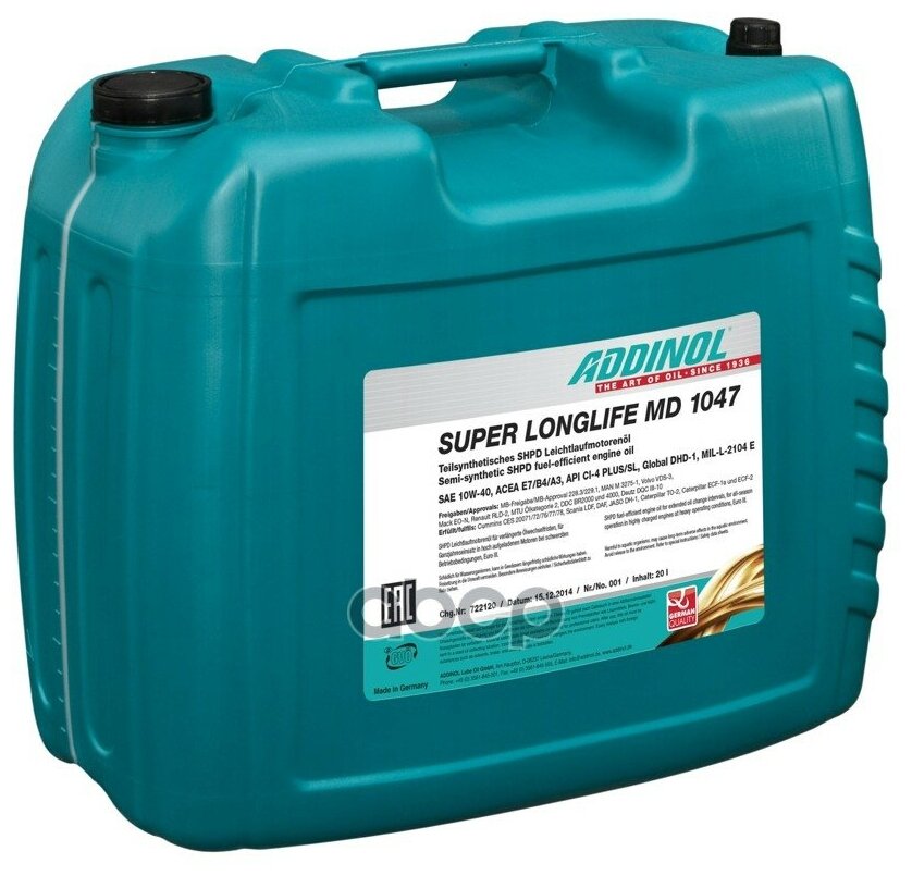 Лучшие цены. Моторное масло легкого хода ADDINOL Super Longlife MD 1047 является продуктом класса SHPD (Super High Performance Diesel) и относится к числу высокотехнологичных продуктов ADDINOL. Полусинтетическое моторное масло ADDINOL Super Longlife MD 1047 (SAE 10W-40) базируется на высококачественных рафинатах минеральных масел, гидрокрекинговых и синтетических маслах (ПАО), а также на оптимальной комбинации присадок. Магазины в вашем городе.