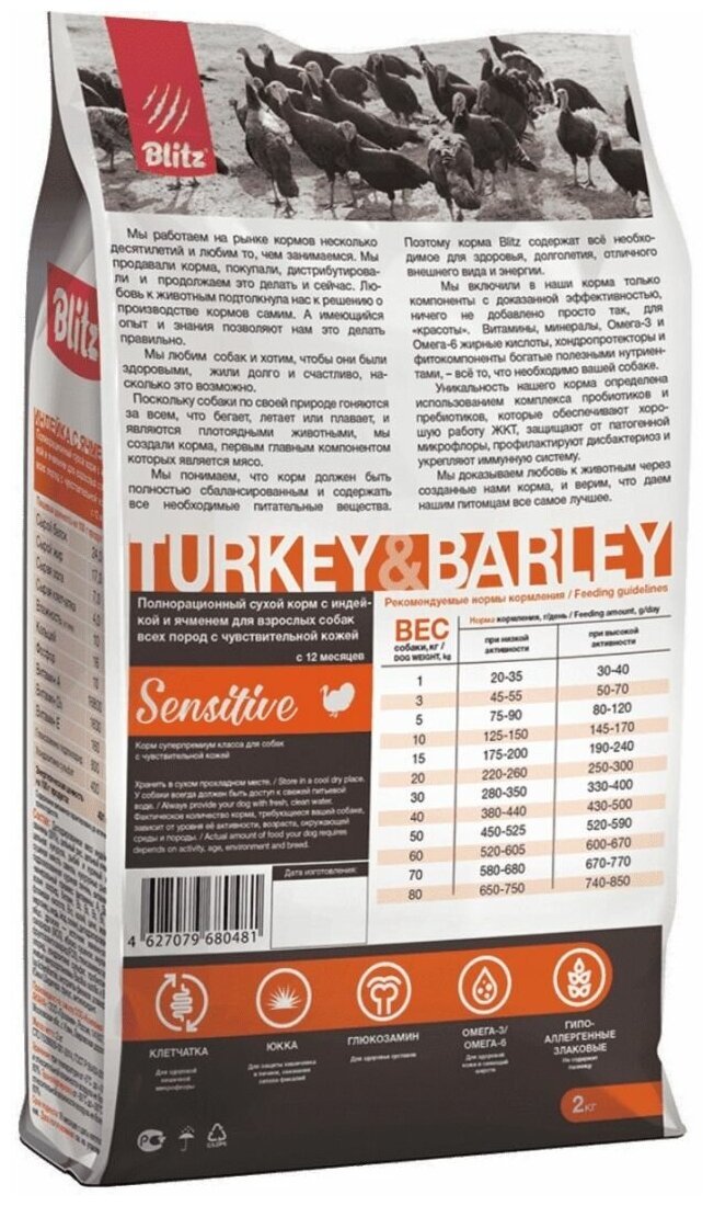 Лучшие цены. BLitz Sensitive Turkey & Barley Adult Dog All Breeds Линия кормов Blitz Sensitive для собак Комплексный сухой корм для собак всех пород Blitz Adult Turkey & Barley All Breeds, с индейкой и ячменём, сбалансирован по всем питательным веществам, витаминам и минералам. Это рацион суперпремиум-класса, который предназначен для взрослых животных, имеющих чувствительный желудок, плохо усваивающих привычную пищу (например, на основе курицы или говядины) или страдающих аллергическими расстройствами. Магазины в вашем городе.