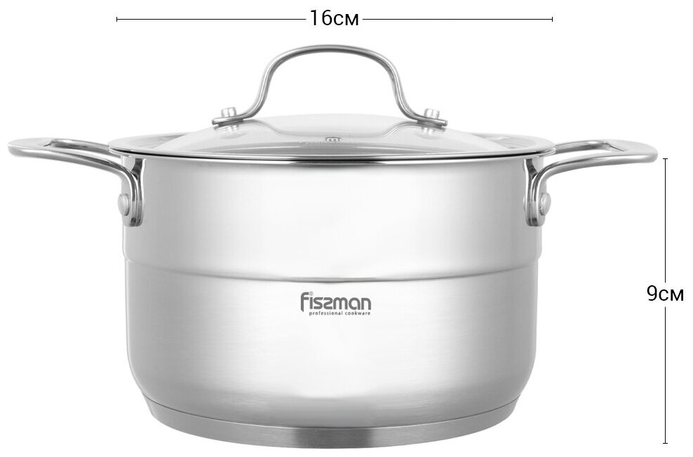 Кастрюля 5371 FISSMAN Кастрюля NORDIA 16x9см / 1,8л с крышкой (нерж.сталь) Ручки-нерж.сталь; Крышка-стекло с ободком; Индукция; Термоаккумулирующее многослойное дно.