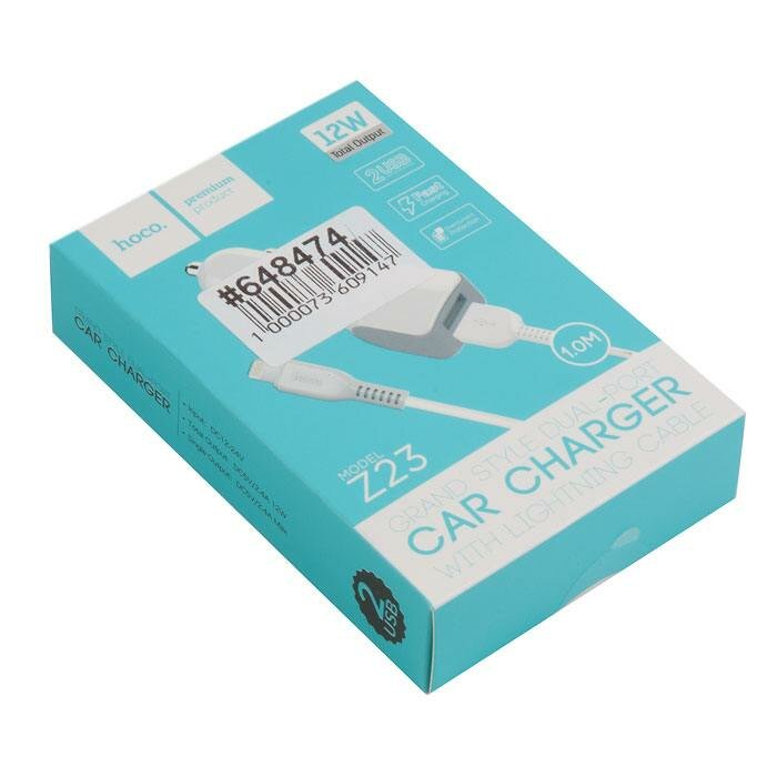 Зарядное устройство Автомобильная зарядка от прикуривателя Hoco Z23, два порта USB, 5V, 2.4A, lightning кабель 1м, белый