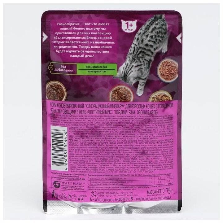 Корм влажный Whiskas пауч для кошек Аппетитный микс Говядина, Язык, Овощи в желе 75г , 28 шт