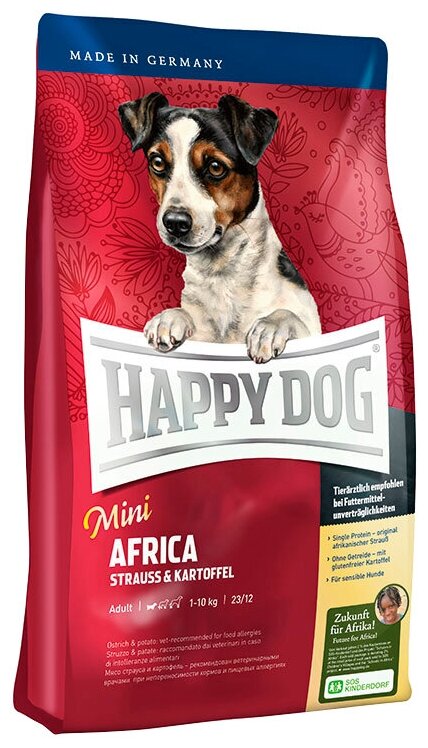 Сухой корм для собак Happy Dog Mini Africa, для здоровья кожи и шерсти, при чувствительном пищеварении, страус, с картофелем 1 уп. х 1 шт. х 4 кг (для мелких и карликовых пород)