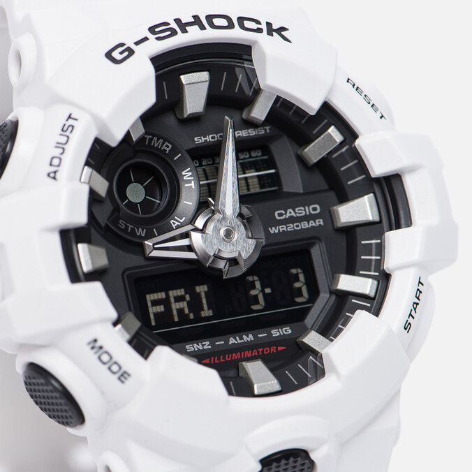 Лучшие цены. Ударопрочные наручные часы CASIO G-SHOCK GA-700-7A. Модель имеет цифровой и аналоговый дисплей, светодиодную подсветку, секундомер, таймер, хронограф, многофункциональный будильник и автоматический календарь. Надежные часы белого цвета с оригинальным дизайном, сделанные из современных материалов, дополнят образ жителя современного мегаполиса. Прочное минеральное стекло. Цифровой и аналоговый дисплей. Автоматическая подсветка LED. Светонакопительное покрытие стрелок Neobrite. Магазины в вашем городе.