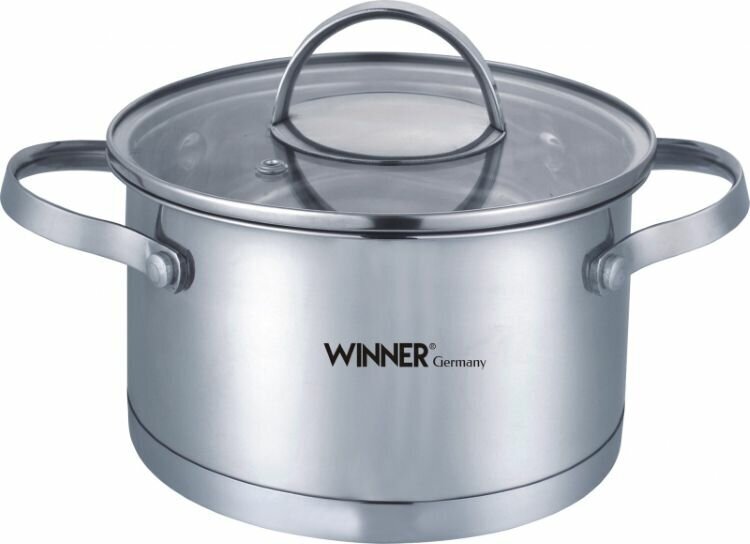 Лучшие цены. Кастрюля Winner ROMA 2.5 л WR-1185 Объем: 2.5 л Диаметр: 18 см Материал: нержавеющая сталь Толщинаы: • стенки: 0.6 мм • дна 2,5 мм (дно капсулированное) Высота стенки: 10 см Мерная шкала на внутренней стенке: общий объем: 2.5 л/ шкала: 1.25 л Внешняя и внутренняя поверхности зеркальные Крышка стеклянная с ручкой из нержавеющей стали Подходит для использования на всех типах плит и для мытья в посудомоечной машине. Магазины в вашем городе.