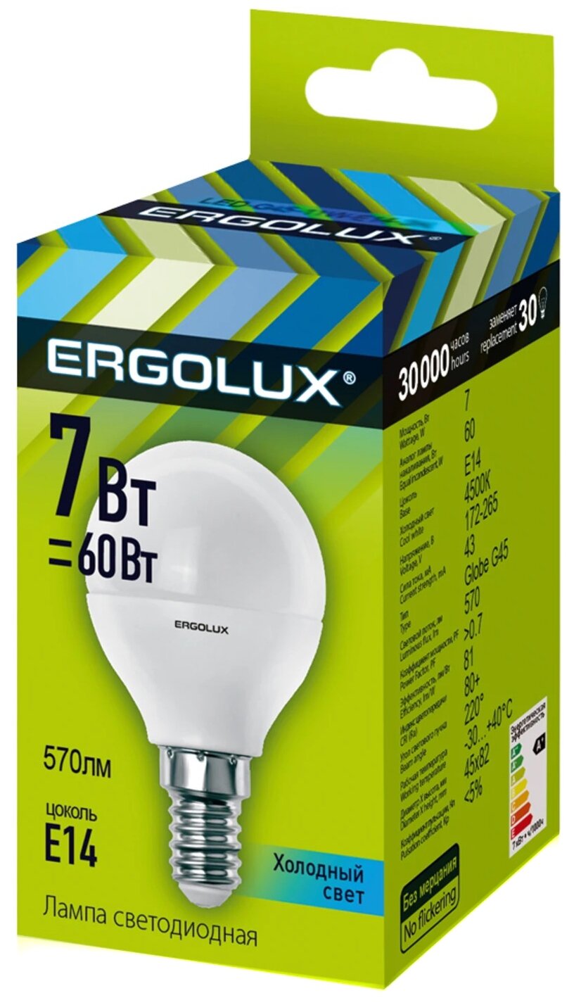 Лучшие цены. Лампа Ergolux LED-G45 оснащена традиционной круглой колбой и подходит для любых приборов с патроном E14. Вы сможете использовать элемент в качестве основного или дополнительного источника освещения. надёжность И комфорт Корпус выполнен из металла и ударопрочного пластика, поэтому не разобьётся даже при падении с небольшой высоты. Мощность 7 Вт эквивалентна 60-ваттной лампе накаливания – свет будет таким же ярким. Но эта модель служит во много раз дольше – в среднем её потенциала хватает на три года. Магазины в вашем городе.