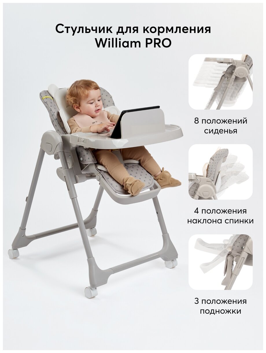 Лучшие цены. Стульчик для кормления WILLIAM PRO – это стильный внешний вид и супер-характеристики. Подходит для самых маленьких – спинка имеет 4 угла наклона, а подножка – 3. Сиденье стульчика снабжено съёмной текстильной вкладкой-матрасиком. У съёмной столешницы 3 положения по длине – еда будет падать на накладной поднос, а не на одежду ребёнка. Съёмный поднос можно мыть в посудомоечной машине. WILLIAM PRO максимально мобилен – все 4 колеса поворотные и снабжены тормозами. Легко складывается, компактен при хранении. Магазины в вашем городе.