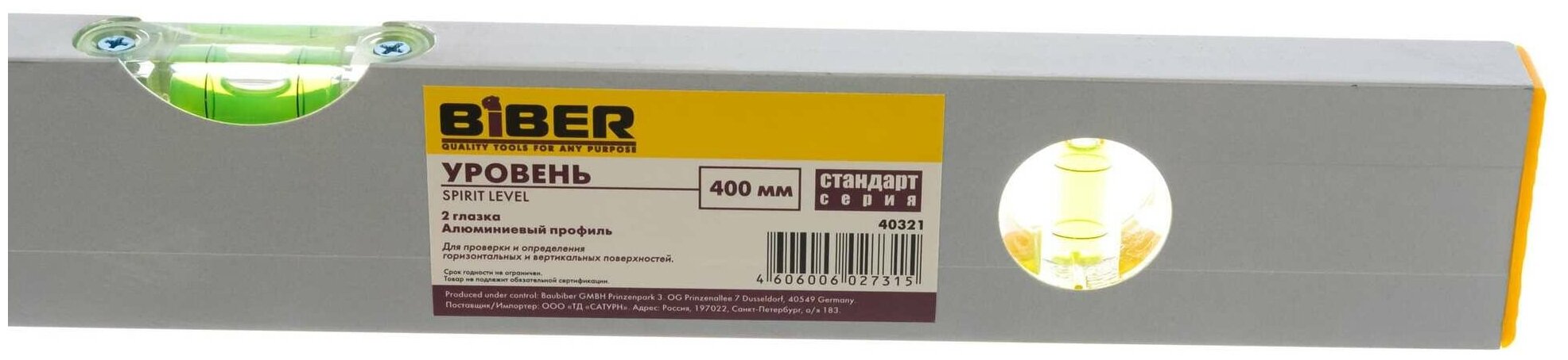 Уровень Biber 40321 Стандарт 400 мм 2 глазка