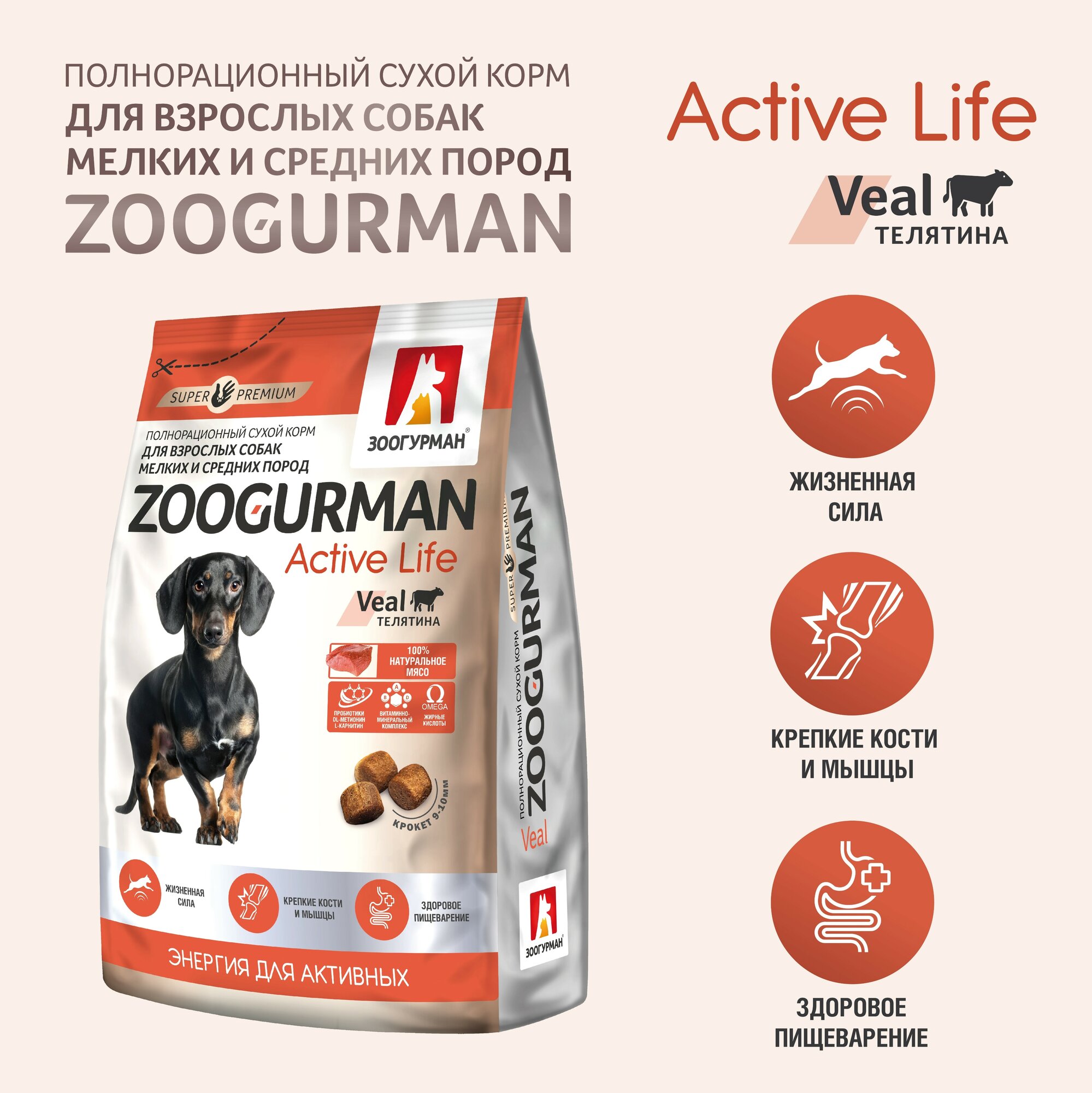 Лучшие цены. Полнорационный сухой корм для собак малых и средних пород Zoogurman Active Life, Телятина Энергия для активных - Жизненная сила - Крепкие кости и мышцы - Здоровое пищеварение. Магазины в вашем городе.