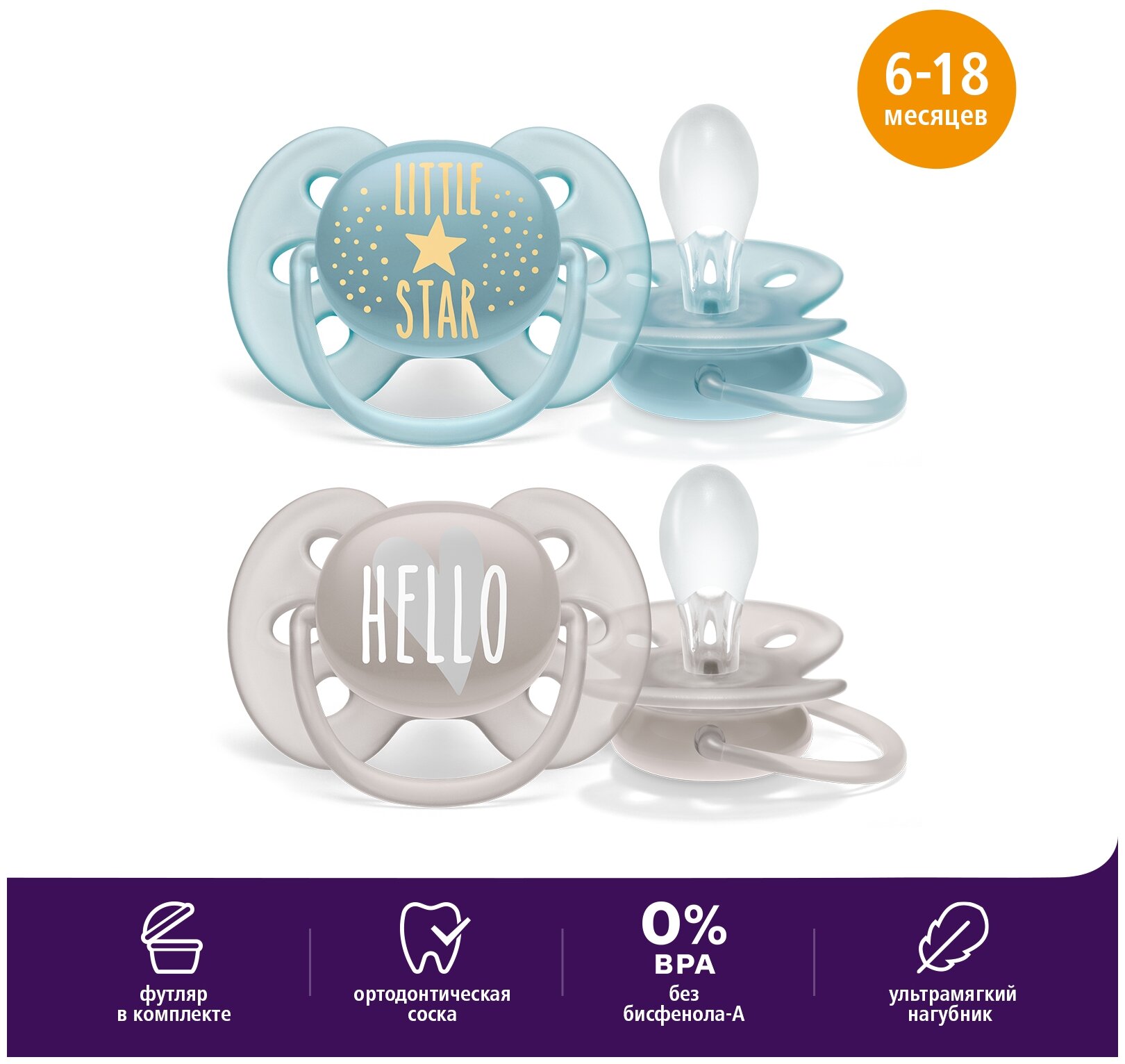 Пустышка ultra soft, Little star/Hello, 6-18 мес., 2 шт, для мальчиков