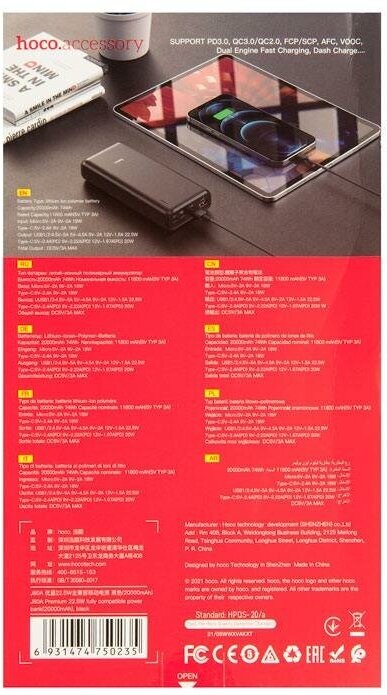 Лучшие цены. Внешний аккумулятор Hoco J80A Premium мощностью 22.5 Вт может заряжать несколько гаджетов одновременно. Он поддерживает технологии ускоренной зарядки, такие как: Quick Charge 3.0 и Power Delivery. Заряжает батарею совместимых моделей телефонов с 0 до 50 процентов за 30 минут, и сам заряжается быстрее аналогичных повербанков. Стильный компактный корпус, четыре световых индикатора, показывающих текущий уровень заряда, и огромный запас энергии в 20000 мАч делают этот портативный аккумулятор надежным помощником. Магазины в вашем городе.