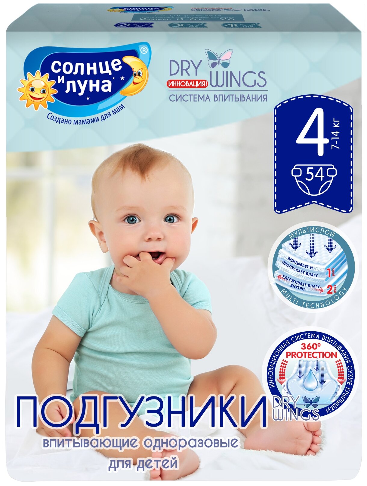 Подгузники Солнце И луна DRY WINGS Premium Подгузники для детей 4/L 7-14 кг 54шт