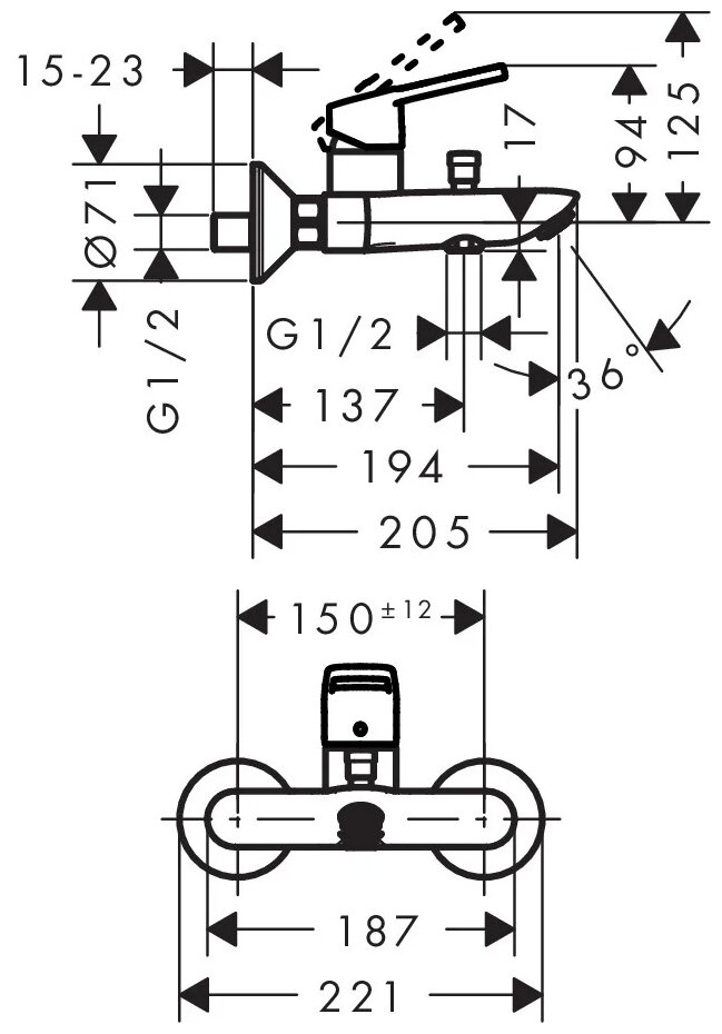 Hansgrohe HG Logis Смеситель для ванны, настенный, излив 194мм, переключатель вакумный, цвет: хром