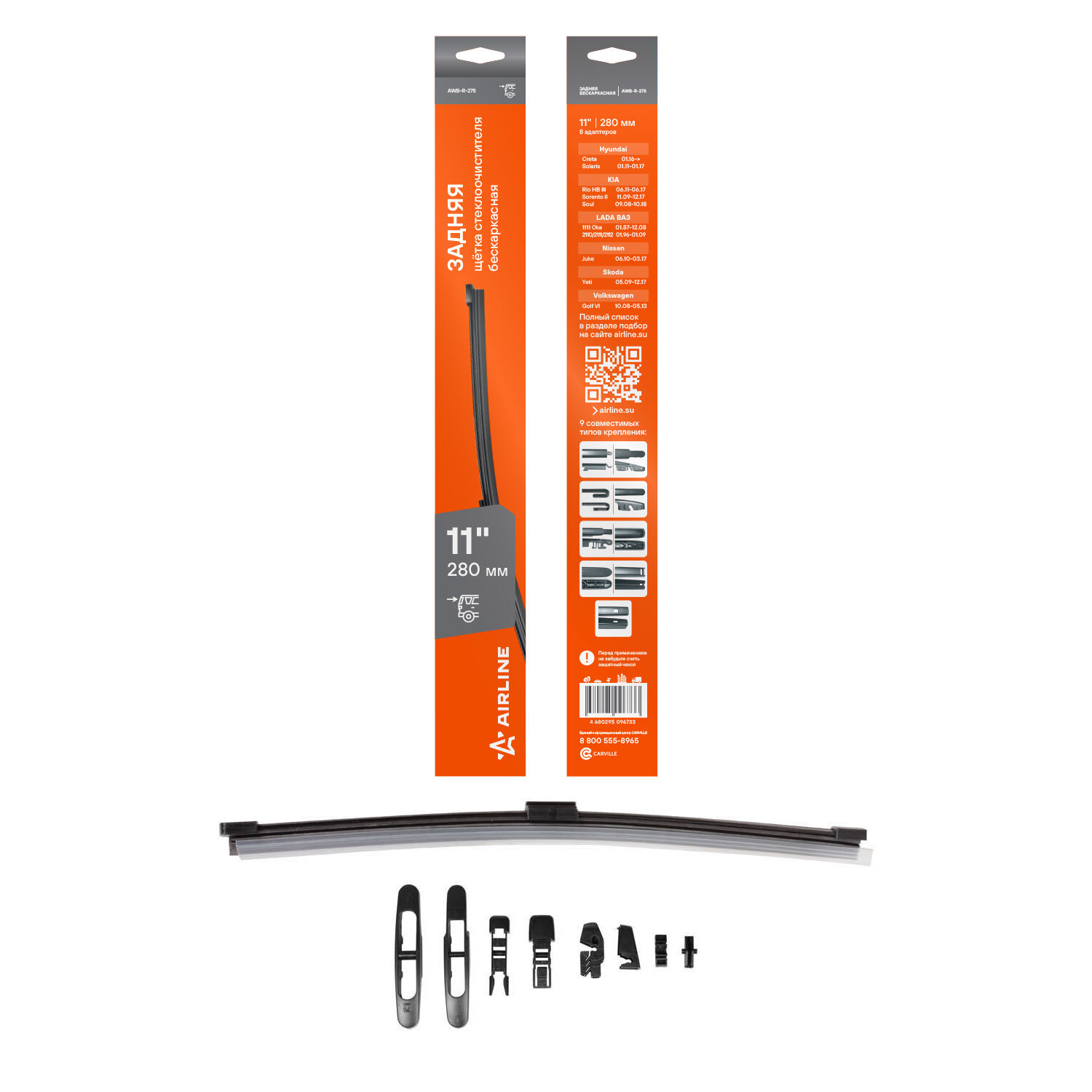 Щетка стеклоочистителя 280 мм (11") задняя бескаркасная, 8 адаптеров AWB-R-275 AIRLINE